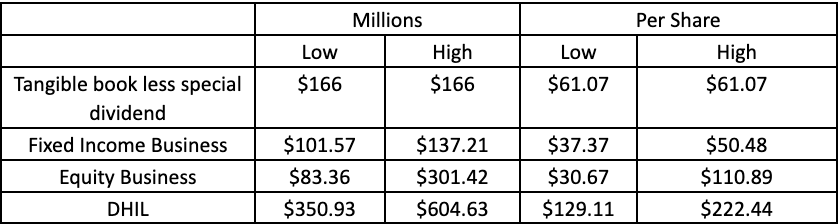 2. Fixed Income - The fixed income business has experienced tremendous growth in recent years. As of 10/31, the firm managed $8.7B in fixed income assets. The short duration securitized ($4.93B) and core fixed income ($3.62B) make up the majority of this franchise that attracted almost $2B in net inflows during the first 9 months of 2025. The company has launched several new strategies recently to continue the rapid expansion of this business. We project growth of between 10% and 20% for the next 5 years before settling in at 2% thereafter. We assume a 32% operating margin and 27% tax rate, which is typical for the firm and discount it at 10%. This leads us to an estimated value range of $101.57M-$137.21M or $37.37-$50.48 per share. While the fixed income franchise has been growing significantly faster than our estimates, this will eventually slow down and we want to leave a margin of safety.